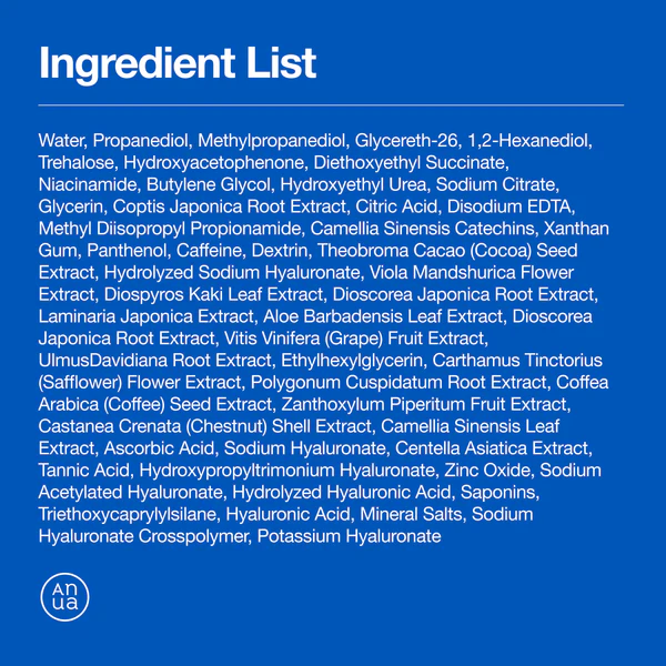 Water, Butylene Glycol, Dipropylene Glycol, Propanediol, Glycerin, Betaine, Diglycerin, Methylpropanediol, Hydroxyethyl Urea, 1,2-Hexanediol, Hydroxyacetophenone, Glycereth-25 PCA Isostearate, Panthenol, Melia Azadirachta Leaf Extract, Xanthan Gum, Ethylhexylglycerin, Disodium EDTA, Melia Azadirachta Flower Extract, Allantoin, Sodium Polyacrylate, Glyceryl Acrylate/Acrylic Acid Copolymer, PVM/MA Copolymer, Theobroma Cacao (Cocoa) Seed Extract, Dextrin, Hydrolyzed Hyaluronic Acid, Hyaluronic Acid, Sodium Hyaluronate, Azelaic Acid, Bisabolol, Dipotassium Glycyrrhizate, Zea Mays (Corn) Kernel Extract, Centella Asiatica Extract, Centella Asiatica Leaf Extract, Centella Asiatica Root Extract, Asiatic Acid, Asiaticoside, Madecassic Acid, Madecassoside, Ceramide NP, Chlorella Vulgaris Extract, Melaleuca Alternifolia (Tea Tree) Leaf Water, Squalane, Dimethylsilanol Hyaluronate, Hydrolyzed Sodium Hyaluronate, Fructan, Pinus Pinaster Bark Extract, Potassium Hyaluronate, Hydroxypropyltrimonium Hyaluronate, Sodium Hyaluronate Crosspolymer, Glucose, Sodium Hyaluronate Dimethylsilanol, Sodium Acetylated Hyaluronate.