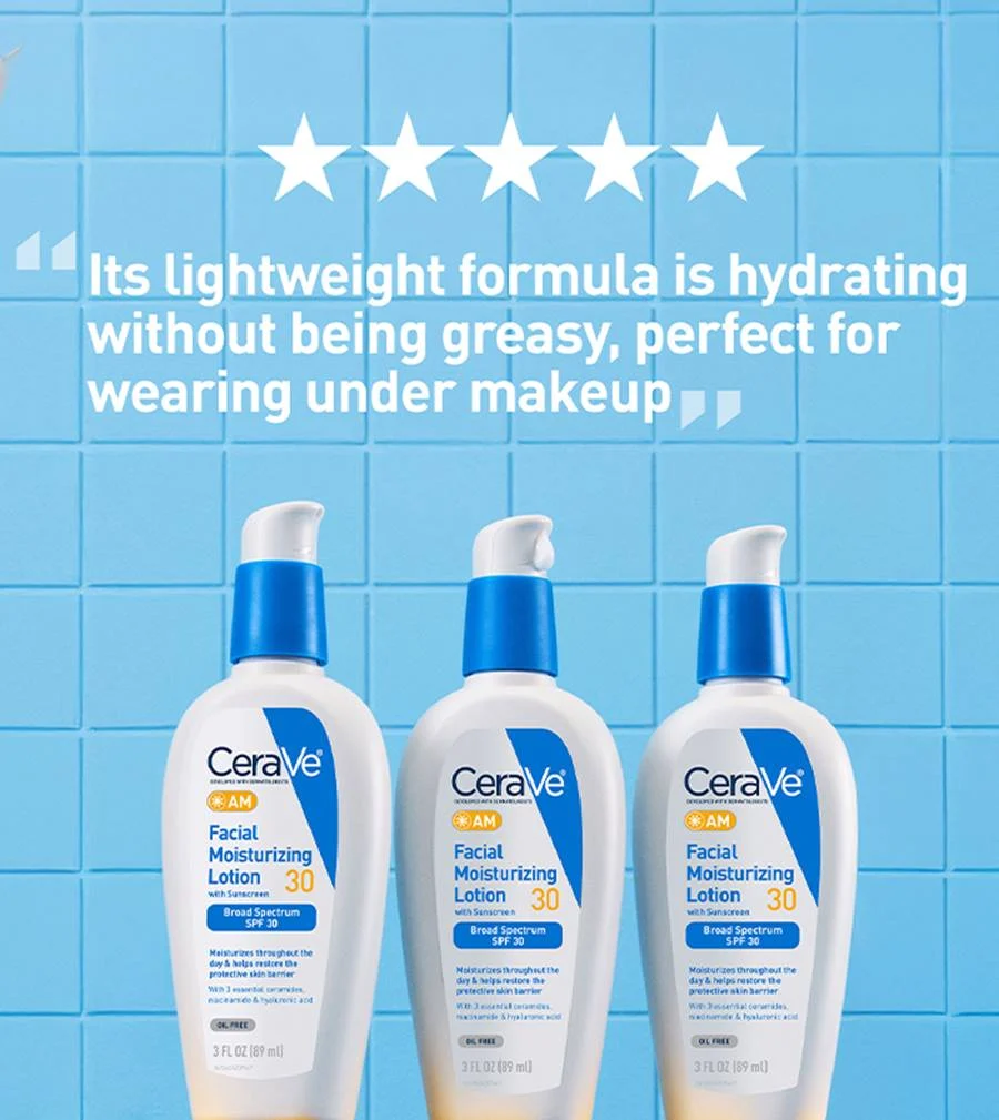 CeraVe AM Facial Moisturizer with broad spectrum SPF 30 sunscreen is a morning skincare multitasker that provides continuous hydration throughout the day while helping to absorb and reflect the sun’s damaging UVA and UVB rays and restore the skin’s protective barrier.