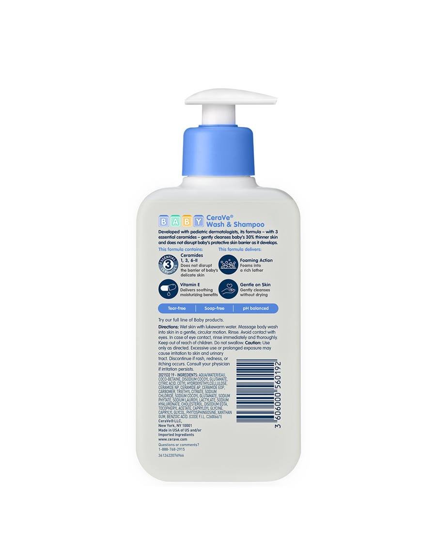 CeraVe Baby Wash & Shampoo was developed with pediatric dermatologists to gently cleanse your baby’s skin and hair with a tear-free, gentle lather that helps make bath time easy and fun. Our gentle baby body wash and baby shampoo is designed to not disrupt baby’s thinner, delicate, skin barrier by combining a fragrance-free, soap-free, tear-free formula with three essential ceramides that leaves skin feeling soft and soothed. Enhanced with hyaluronic acid, vitamin E and three essential ceramides, CeraVe Baby Wash & Shampoo gently cleanses for clean, nourished-looking skin. Mild body wash and shampoo for baby creates a mild foam as you lather it into skin and rinses clean with no residue to leaving skin feeling hydrated and fresh without stripping essential moisture.