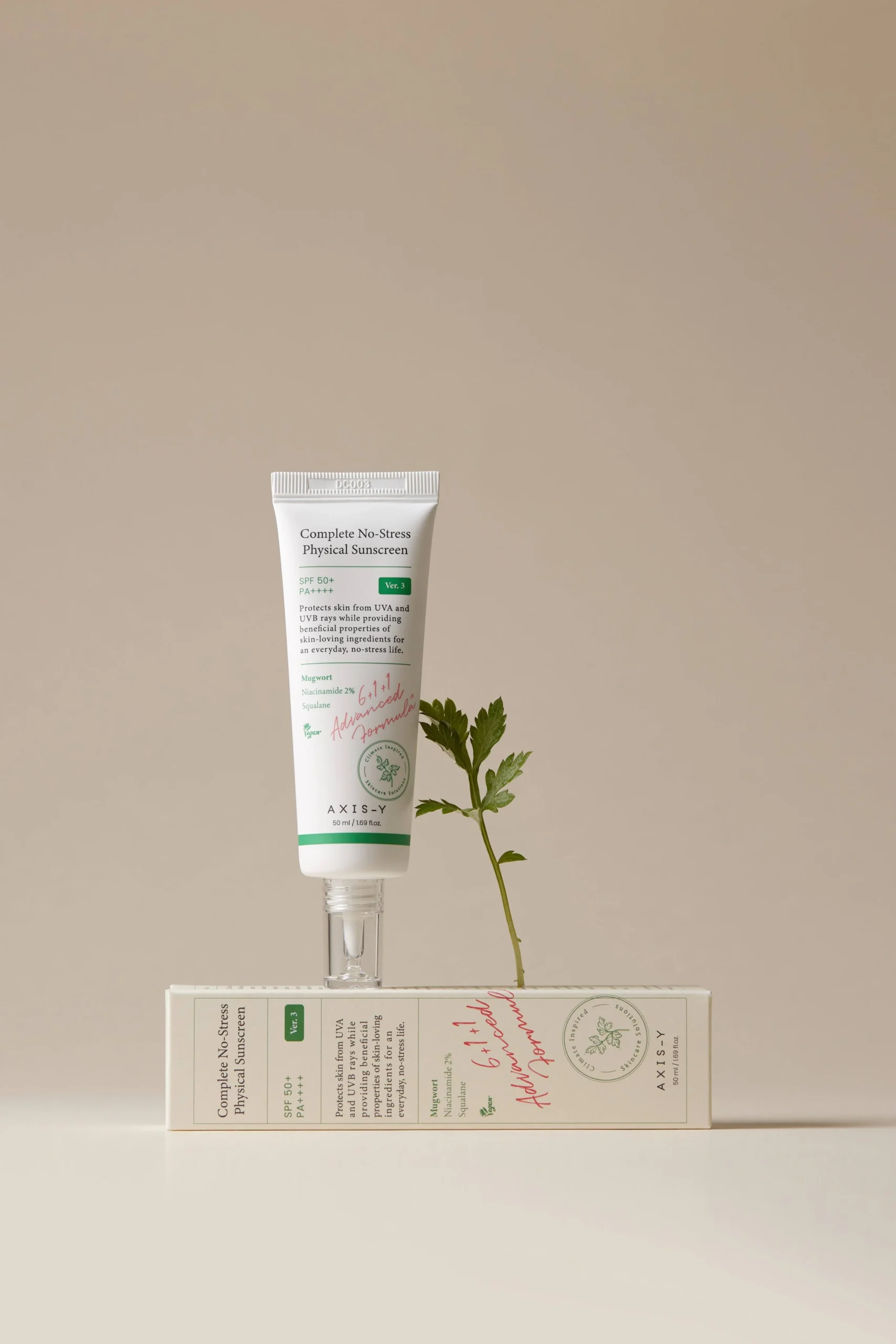 The Complete No-Stress Physical Sunscreen is a 100% mineral, reef-safe sunscreen infused with 2% Niacinamide, Mugwort, Green Tea, and Chamomile. It provides broad-spectrum UVA & UVB protection while calming inflammation and keeping skin hydrated—all with a non-greasy, essence-gel texture that won’t pill or leave a white cast.