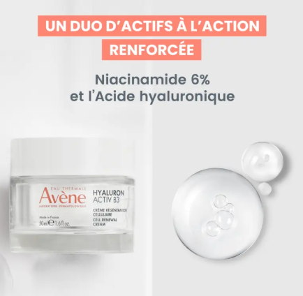With age everything accelerates. Ageing cells spread and the skin functions in slow motion. The Avène dermatological laboratories have created Hyaluron Activ B3 cream, concentrated at 0.2% in pure hyaluronic acid (high and intermediate molecular weight) and niacinamide (6%) to act on the cause of ageing and prolong the life of the cells*. The skin is plumped, smoothed and radiant after the very first application. After 2 weeks, it is regenerated, firmer and wrinkles are reduced**. Its velvety, delicately scented texture provides comfort to the skin. It is also a very good make-up base. Hyaluron Activ B3 Cellular Regeneration Cream is an eco-designed skincare product containing 92% ingredients of natural origin and comes in a 100% refillable glass jar.