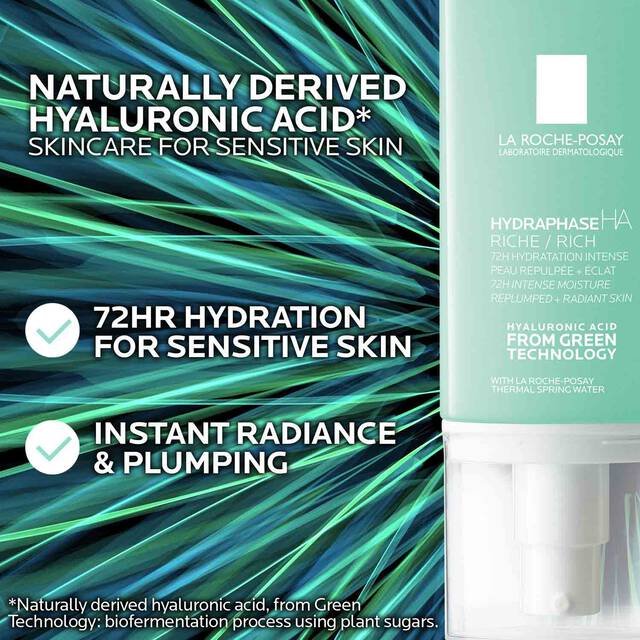 This rich face cream is formulated with naturally derived hyaluronic acid from Green Technology* and La Roche-Posay Thermal Spring Water to moisturize and soothe dehydrated skin. Apply this hyaluronic acid face cream for dry skin daily for 72Hr hydration and an immediate plump for radiant-looking skin.