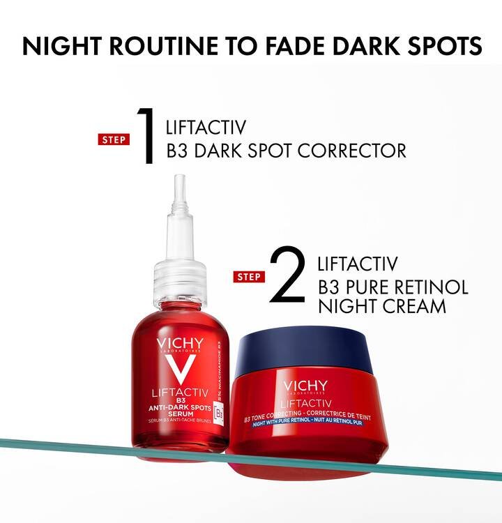 During the day, discoloration and uneven skin tone can be accelerated by exposome aggressions (UV, pollution). Night is the ideal moment to renew the look of discolored skin. The new B3 Tone Correcting Cream, Night with Pure Retinol, has two powerful derm ingredients in a comforting night cream. Powered by 4% niacinamide (Vitamin B3) and 0.15% Pure Retinol, the skin feels renewed, and the skin tone looks more even. Skin looks more radiant and tone is more even.