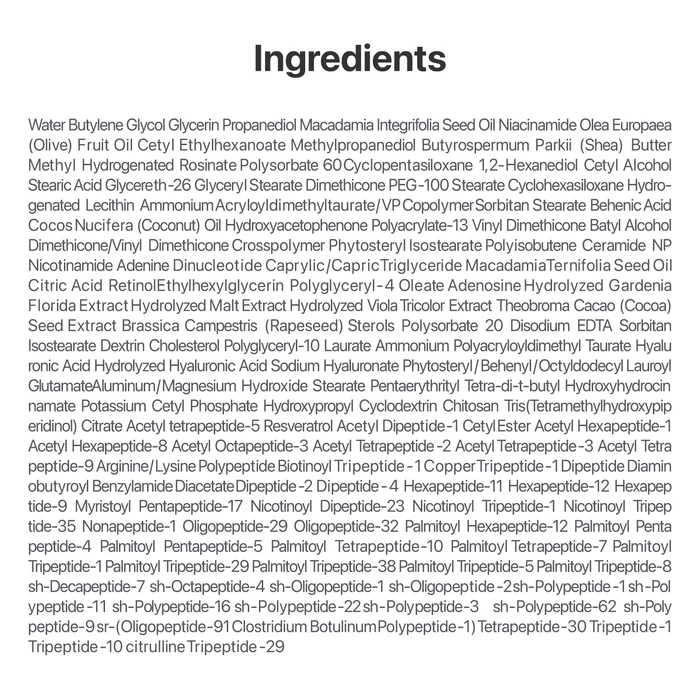 [KEY INGREDIENTS] Formulated with NAD+, a powerful anti-aging ingredient that supports collagen production and skin repair, along with 50 types of peptides to plump and firm the skin. Retinol smooths skin and reduces the look of wrinkles, while ceramide nourishes and strengthens the delicate eye area. Niacinamide brightens dark circles and rejuvenate the entire eye area restoring vitality and radiance.