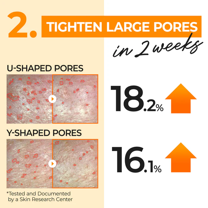 [CLINICALLY TESTED] Clinically proven to improve skin radiance by 52.89%, skin elasticity by 9.09% and tighten enlarged pores by 18.2% in just 2 weeks. Effectiveness enhanced by 214% when used in combination with no.3 serum. Skin irritation and hypoallergenic tests completed, making it safe to use for sensitive and acne-prone skin types.