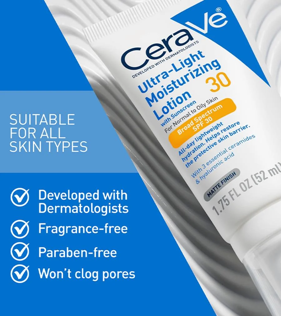 CeraVe Ultra-Light Moisturizing Lotion for normal to oily skin includes broad spectrum SPF 30 sunscreen to help protect skin from sun damage, which can lead to premature signs of aging and skin cancer (when used as directed with other sun protection measures) plus hyaluronic acid and three essential ceramides to hydrate and help restore the skin’s barrier all while leaving a matte finish.